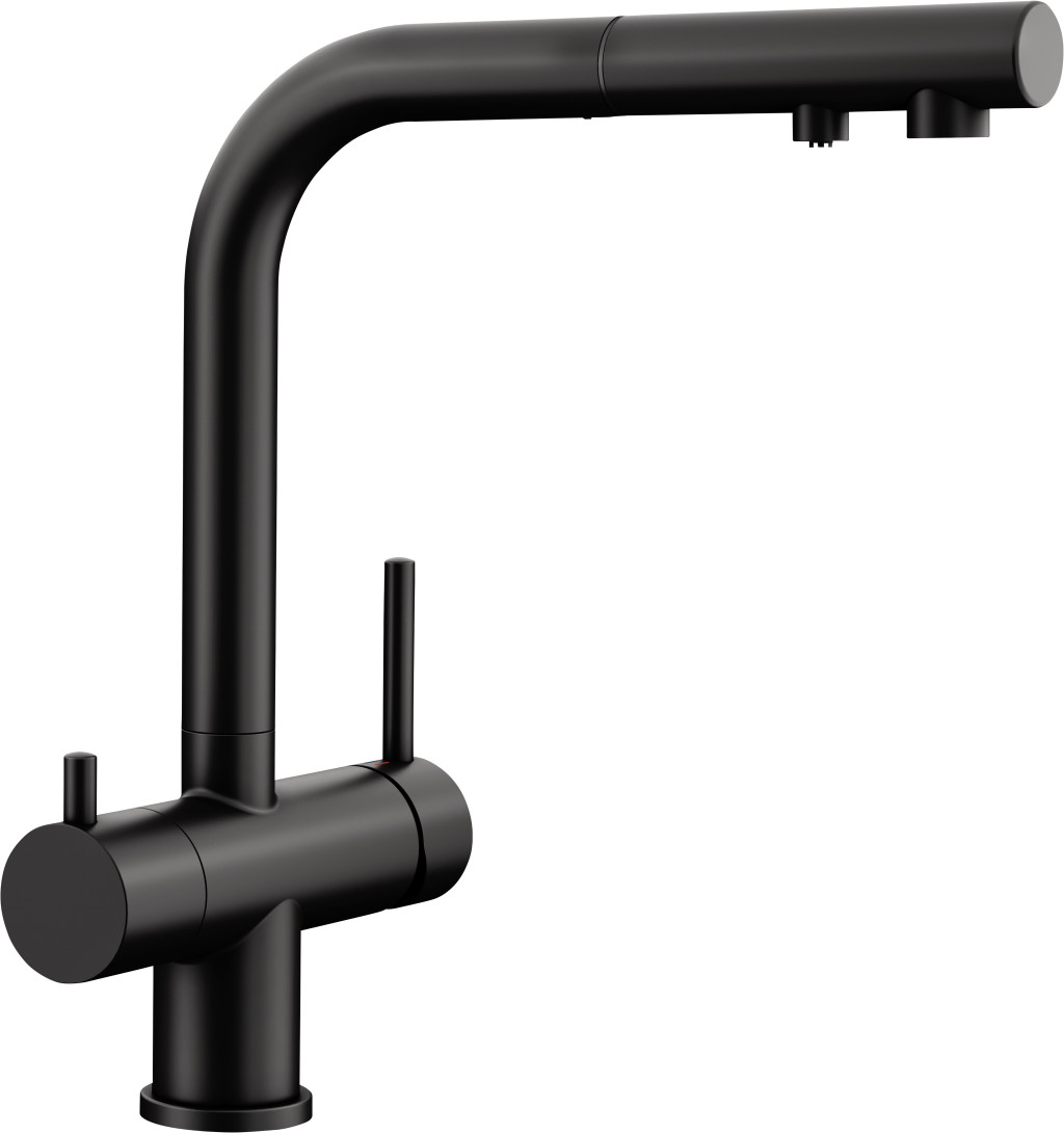 Kényelmes 3 az 1-ben csaptelep: szűrt és szűretlen víz a kihúzható tömlőből. Fekete matt felületkezelés a környezethez való pontos illeszkedés érdekében. Különálló vízkör: hideg- és melegvíz-kar a jobb oldalon, szűrtvíz-kar a bal oldalon. Külön vízkör külön kifolyócsővel a szűrt vízhez – nincs keveredés a hálózati vízzel. Helytakarékos és praktikus: a 3 az 1-ben csaptelep segítségével nincs szükség további csapfuratra a szűrt vízhez. A mosogatókhoz és medencékhez tökéletesen illő felület. Vízszűrő rendszerrel együtt kell telepíteni. 3 az 1-ben: csapvíz és szűrt víz ugyanabból a csapból.